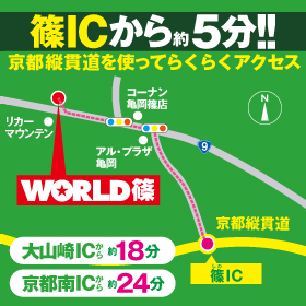 ワールド篠店は京都府の亀岡エリアにある店舗で京都縦貫道「篠インター」から車で約3分ほどの場所にあります。