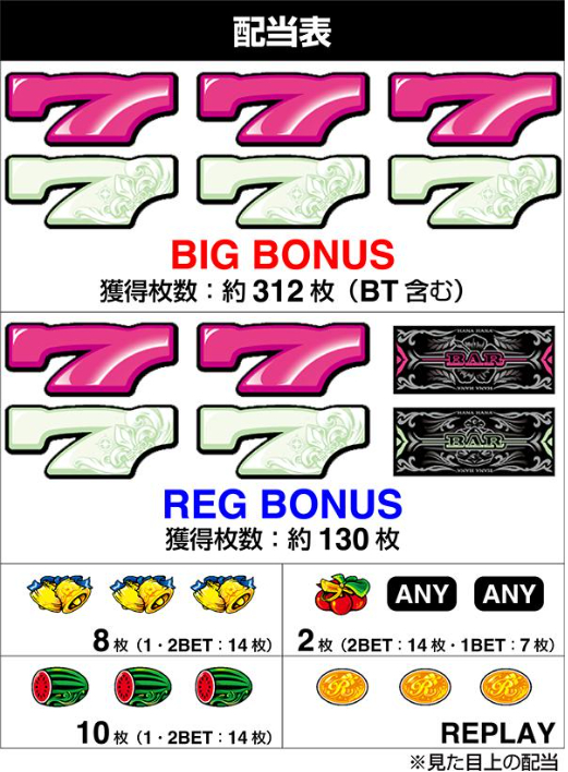 | ボーナス獲得枚数 | BIGボーナス:約312枚 REGボーナス:約130枚 |