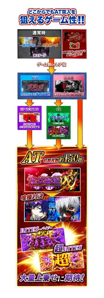 | メインパート | 純増約4.0枚/Gの差枚数管理型AT レア役や規定ゲーム数で上乗せや喰種対決を抽選 |