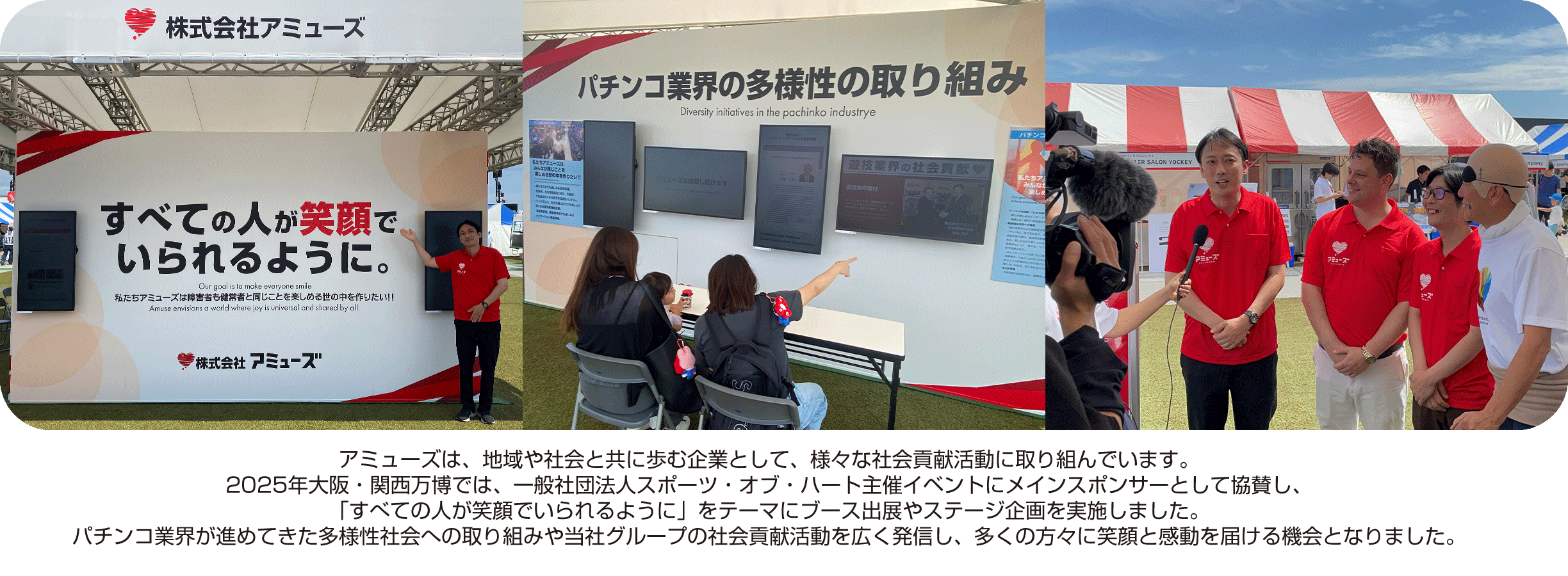 アミューズでは「24時間TVチャリティー活動」に協力しております。毎年、国内外で支援を必要とする分野のための募金活動を行い、より良き社会の形成に寄与することを目的として、「福祉」・「環境」・「災害復興」等の支援活動に努めています。またほかにも災害復興に向けた義援金として、募玉や募メダルを募金にかえて寄付活動も行っております。