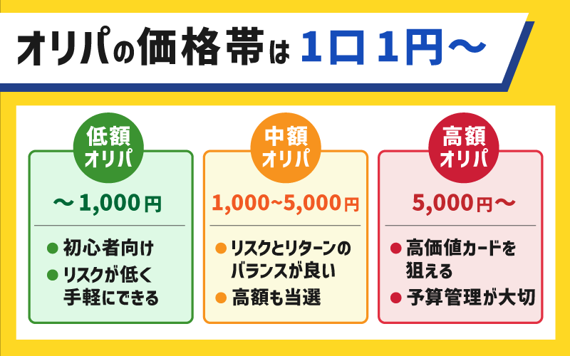 オリパの価格帯は非常に幅広く、1口1円~の低額オリパから1口1万円以上する高額オリパまでさまざまです。