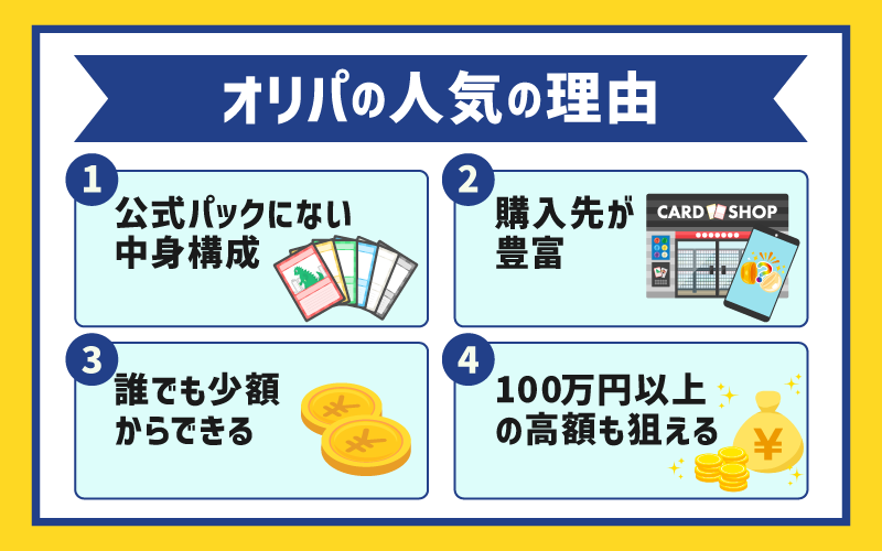 近年、オリパの人気は右肩上がりで上昇しています。なぜこれほど多くの人がオリパに熱中しているのか、その理由を4つご紹介します。